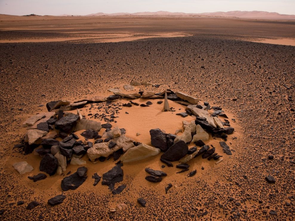 Carefully chosen light and dark stones mark the isolated grave of a herder who died between 5,000 and 3,000 years ago. As rainfall dwindled, the inhabitants of Libya’s remote Fezzan region congregated around scattered oases.